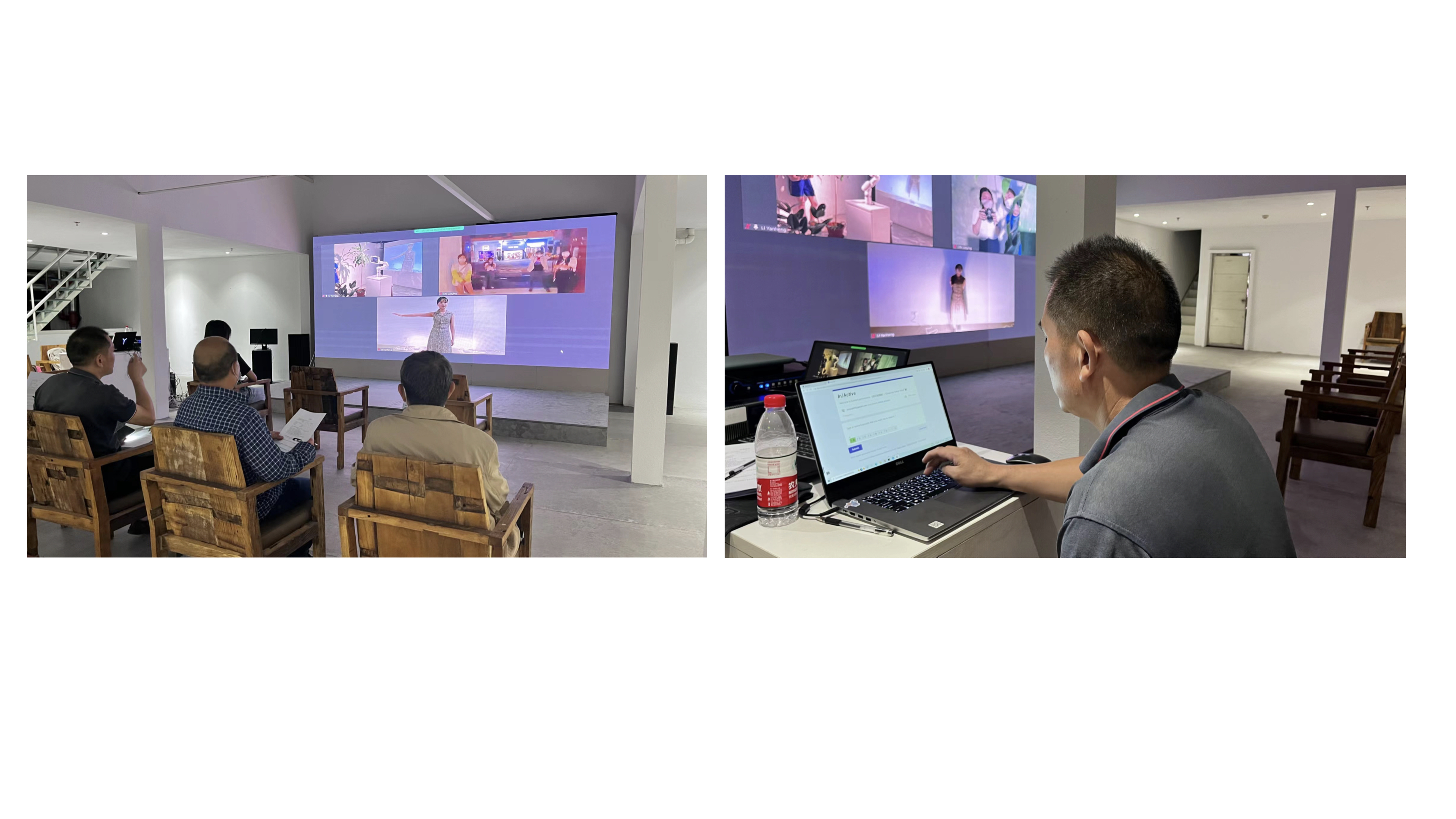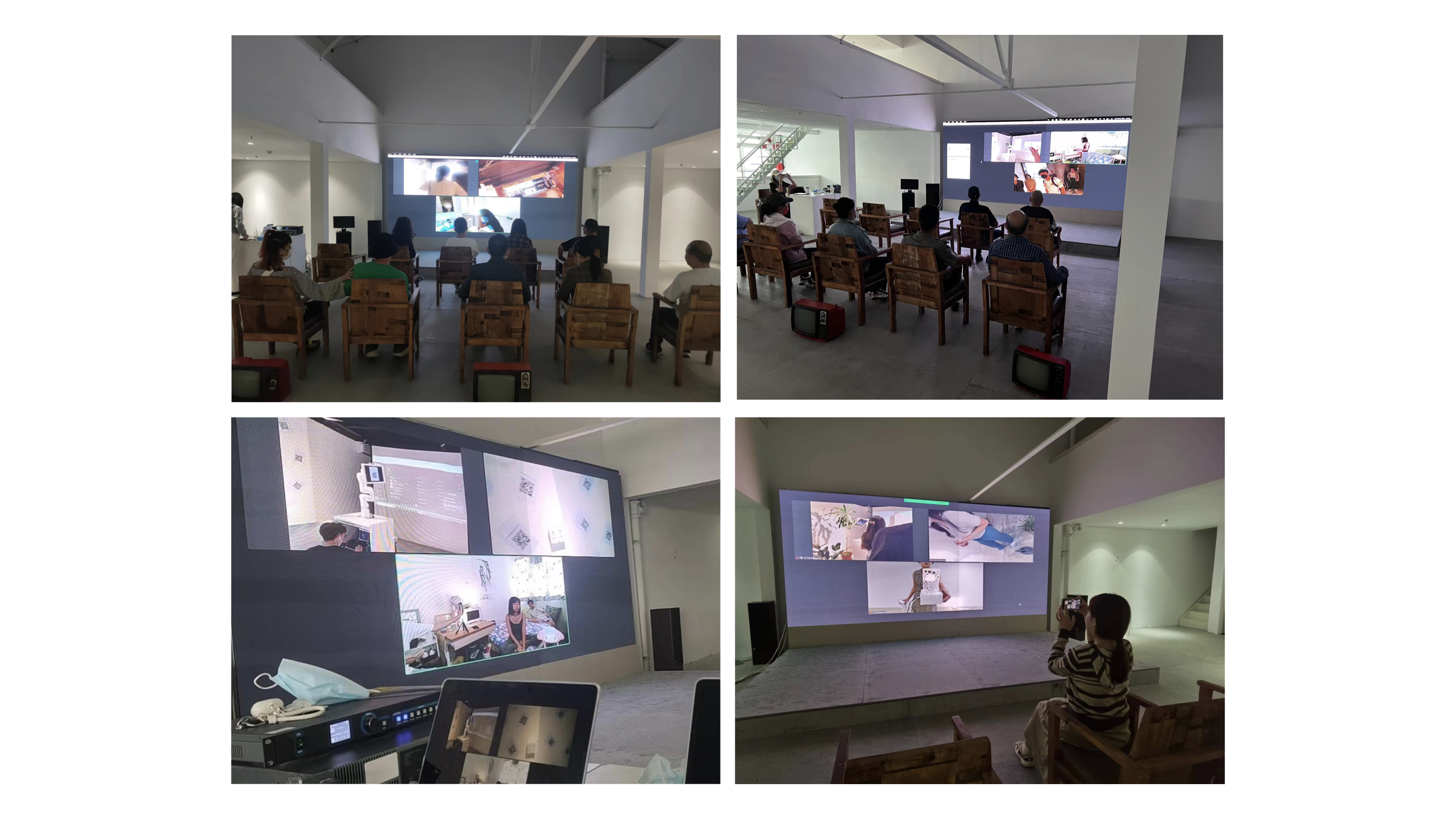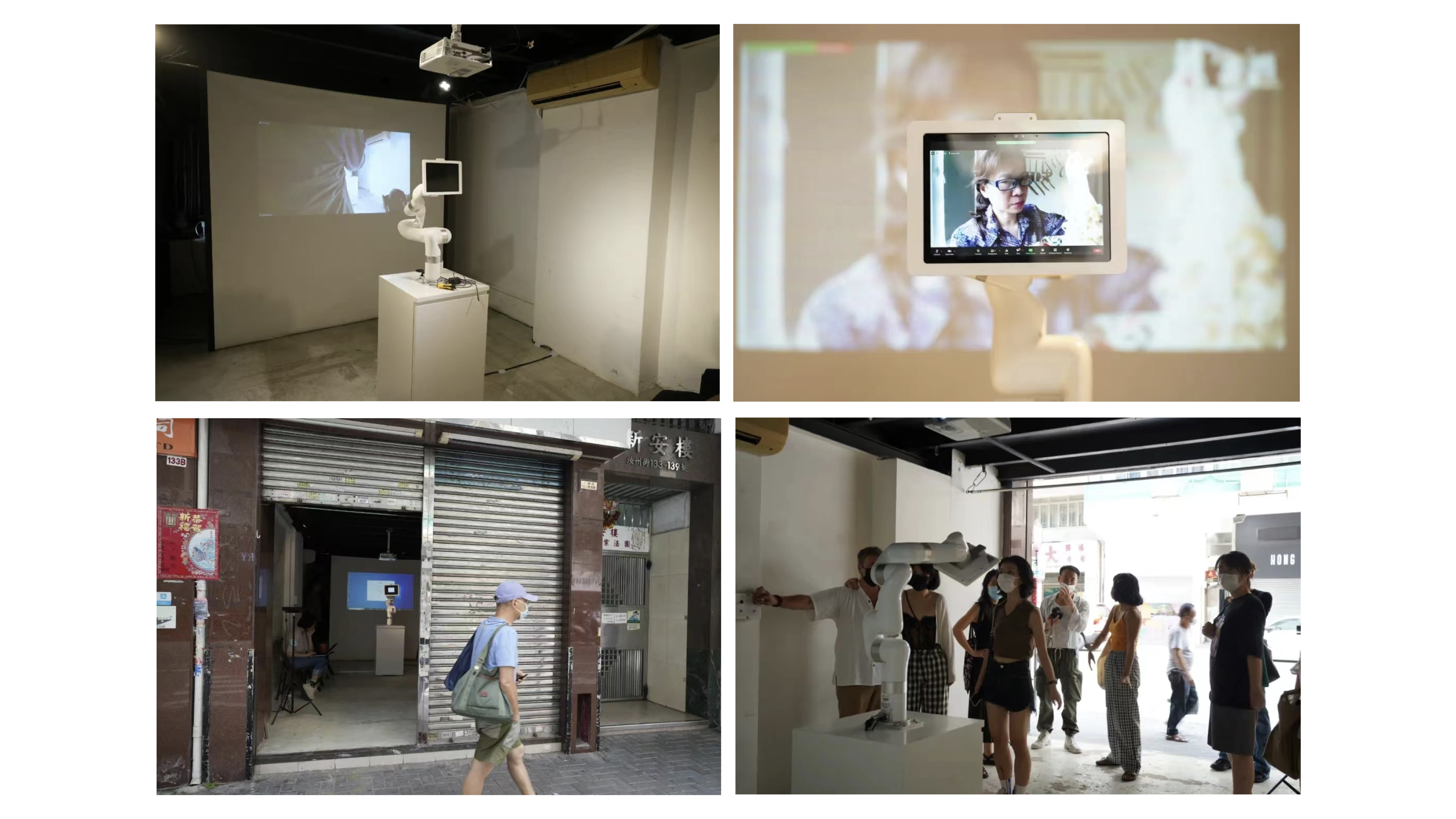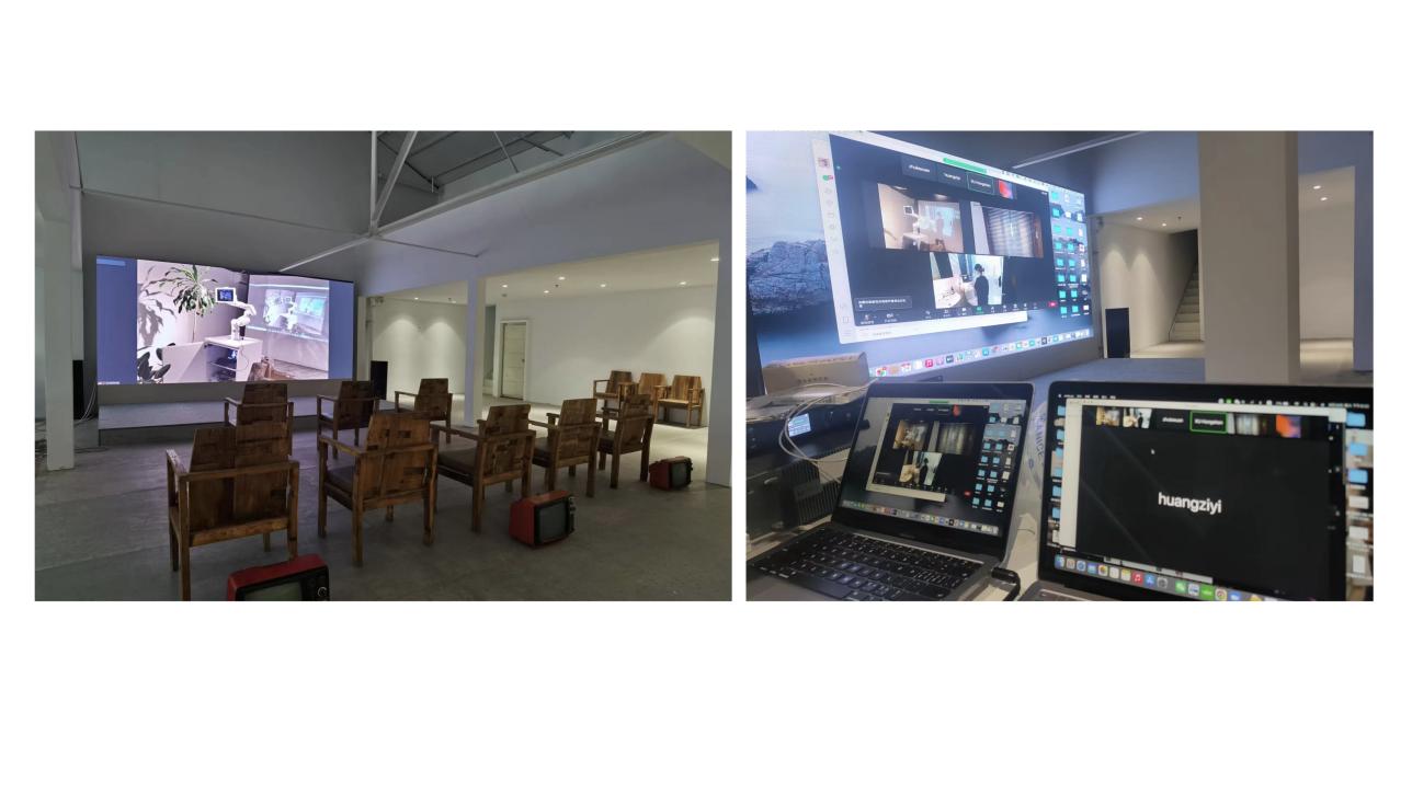 员工为此次展览的顺利实施开展了一系列展前准备,包括提前布置会场,检查音视频和交互设备,线上与香港主展区联系并调试画面,印制纸质版调查问卷等,力图为观众营造舒适观展感受,做好宣传及场内外引导工作。展览期间,大稿国际艺术区展览通过与香港主会场进行线上视频的方式,将实时内容投屏到现场进行转播。走入展区的观者会看到大屏幕上的三或四个来自不同场景的实时画面:其一是一个空屋中放置一只机械手臂,一台掌上电脑,一个投影机,除此,似乎再无它物;其二是投影机中的显屏画面,同样只有一个孤寂的人,独自吃着,独自做活,甚至独自做出种种我们绝不会在人前展示的怪动作;其三是空屋外热闹的商街,虽然行人往来落绎不绝,但行人与行人之间是陌生的,每一个行人都是单一的个体。展览中还设置了观者与表演者交互的场所,观者可以在现场调试好的交互程序上留下想对表演者说的话。