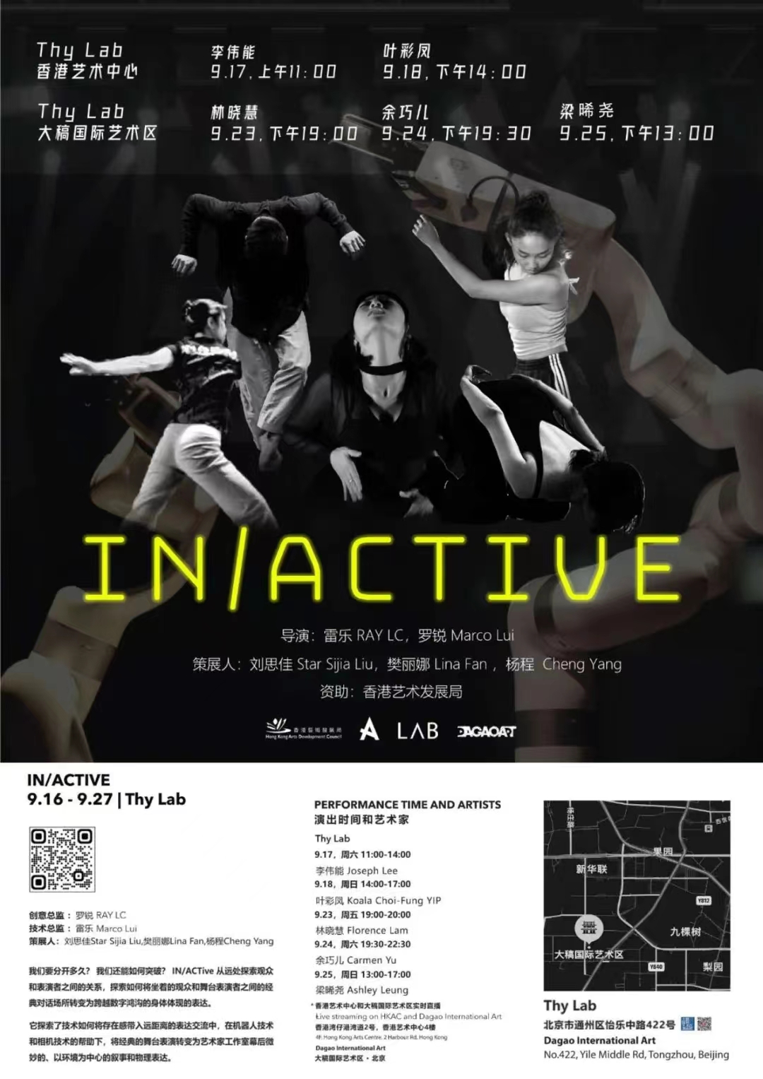 2022年9月23至25日期间,樊丽娜老师带领本工作室员工与香港艺术中心联合于北京大稿国际艺术区策划了以《IN/ACTIVE》(《机械臂之舞》)为主题的展览活动。该展览由香港艺术发展局出资,分别于香港艺术中心和北京大稿国际艺术区进行展示,为两座城市分别带来了一场朝气蓬勃的新概念演出。