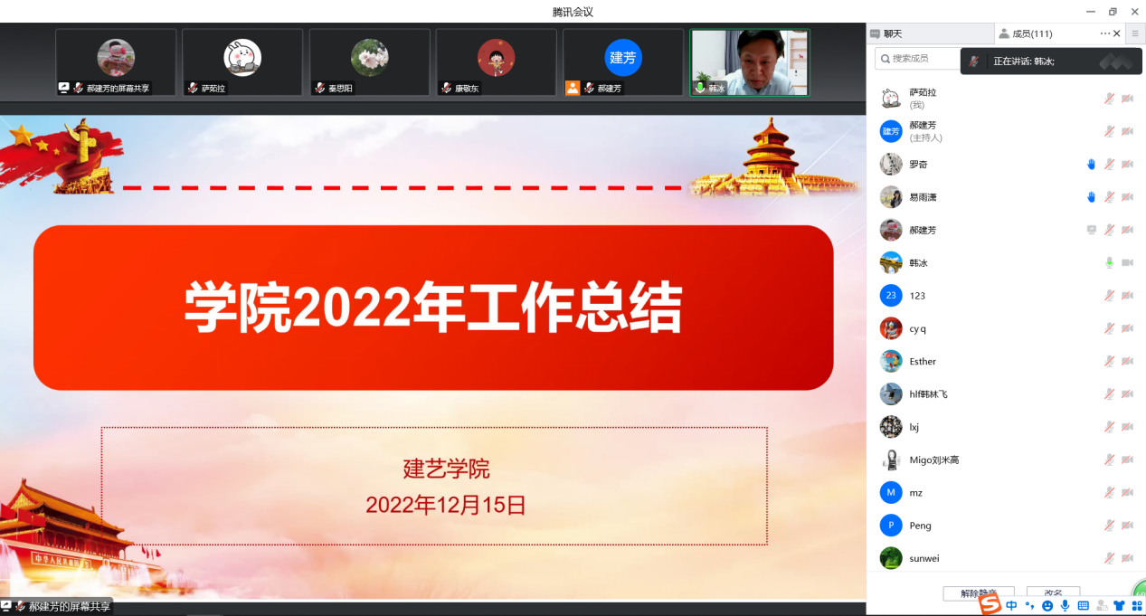 首先,经理韩冰就党建及思想政治工作、人才培养、科学研究、团队建设、人才队伍建设、对外交流合作、外联及社会服务、学院治理等方面进行了2022年度学院工作总结。