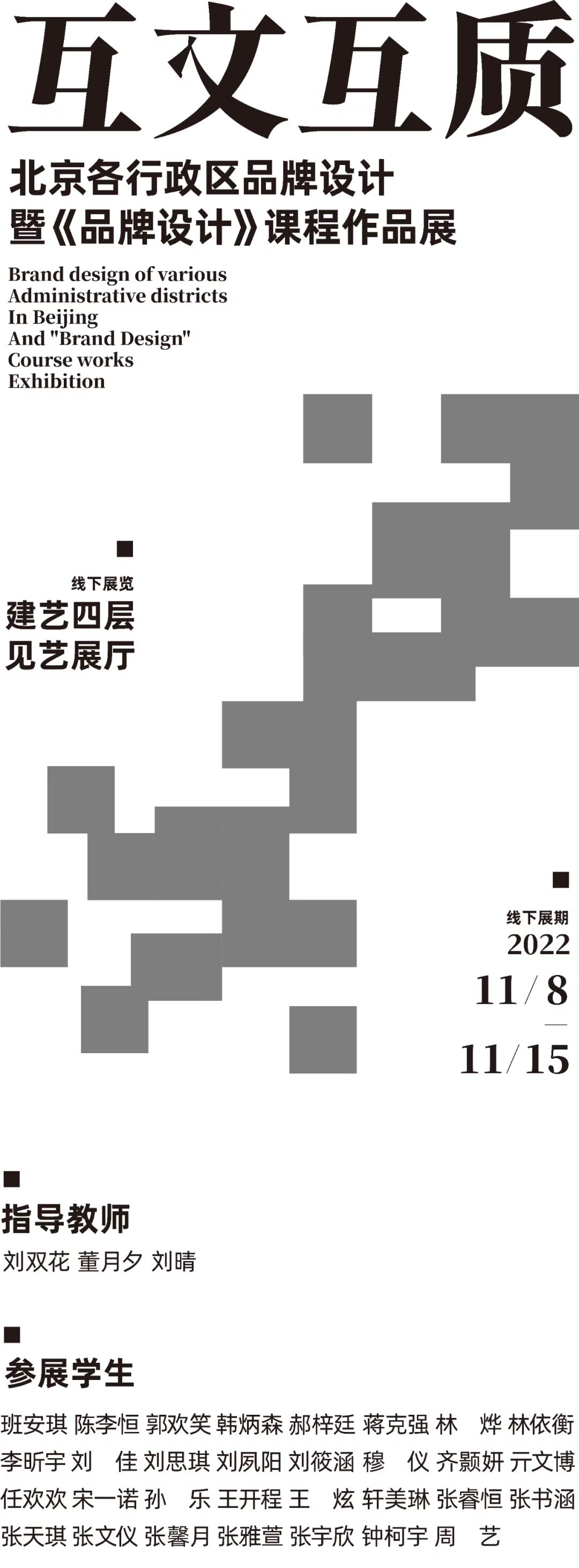 10月底至11月初,必威betway建筑与艺术学院第11工作室在导师刘双花、董月夕指导下,带领工作室成员及2001班部分同学,共同为为期六周的《品牌设计》课程策划了线上和线下展览。11月9日,名为“互文互质|2022《品牌设计》课程作业展”如期开展。展览展示了工作室成员及所在班级2001班同学的课程成果,包括东城、西城、朝阳、海淀、丰台、顺义、通州、石景山、延庆、怀柔、房山、门头沟、密云等13个首都行政区的品牌形象设计。