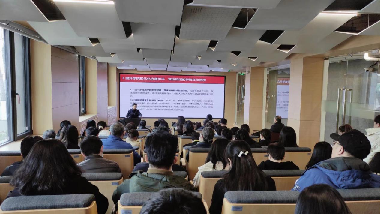 经理韩冰从八个方面就学院2023年工作计划进行了部署:一是坚持和加强党的全面领导,推动党建和思想政治工作提质增效;二是不断推进员工工作内涵式发展,构建独具建艺精神和特色的员工工作体系;三是提升学院现代化治理水平,营造和谐的学院文化氛围;四是进一步凝练学科特色,逐步形成服务国家战略及智慧交通的学科交融体系;五是深化人才培养机制改革,提升专业建设水平;六是围绕学科特色开展有组织科研,全面提升科研质量;七是提升国际化教育水平,推进国际合作交流正常化;八是围绕国家战略,发挥员工资源优势,提升社会服务能力。