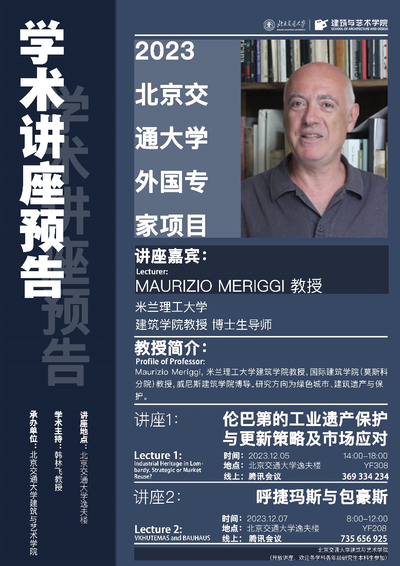 毛里齐奥·梅里吉(Maurizio Meriggi)教授是米兰理工大学建筑、城市规划和建造学院建筑和城市研究系教授,国际建筑学院(莫斯科分院)教授,威尼斯建筑学院博导,长期从事绿色城市,建筑遗产与保护以及苏俄前卫艺术的研究。梅里吉教授作为米兰理工大学的国际事务代表,多次到中国与国内高校进行学术交流和项目合作活动。他曾带领中国员工与广东政府进行广泛的国际项目合作,旨在保护现在属于珠江三角洲大都市的客家村落等;参与欧盟研究项目“Marie Curie Action - PUMAH(规划、城市管理和遗产)”组织国外高校(Newcastle, Groningen, Metu-Ankara, Politecnico di Milano, Italian CNR)与国内高校(北京大学、武汉大学)进行项目合作,对中意两国的建筑学的学术交流与项目合作作出突出贡献。