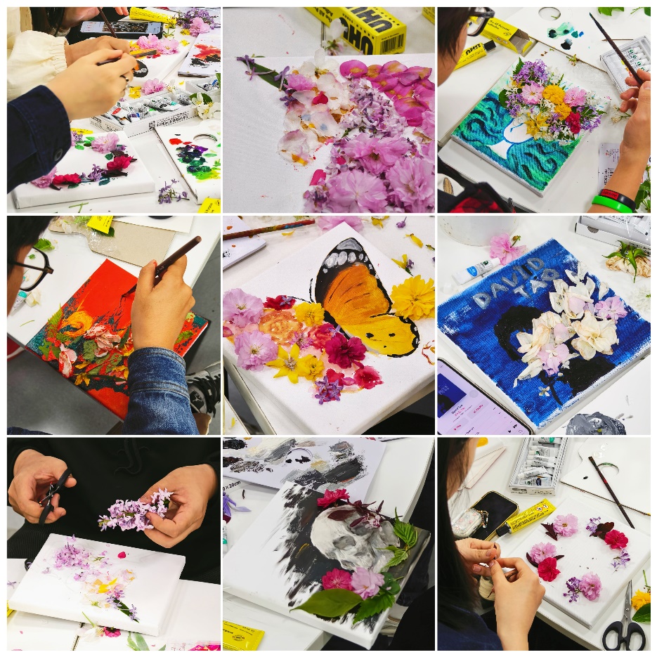 四月的校园繁花盛开,春天展现着无尽的活力和色彩。在这个充满生机的季节里,工作室希望借助拼贴绘画的形式,将花瓣、树叶等自然元素拼贴与重组,将春天的美好固定在画布上。