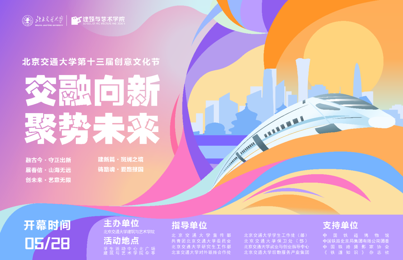 必威betway创意文化节已经连续举办了十三届,从最初的课程成果展示,逐步与爱党爱国、爱校荣校教育相融合,从第二课堂实践逐渐发展成了“5+1”实践育人体系,已成为北京高校思政工作创新示范案例。今年创意文化节以“交融向新,聚势未来”为主题,寓意在新征程的起点上,以交通为特色融合学科发展,传承创意文化节初心,弘扬中华优秀传统文化,以交通为特色融合学科发展,适应新的形势,运用新的科技,开拓创新走向美好未来。