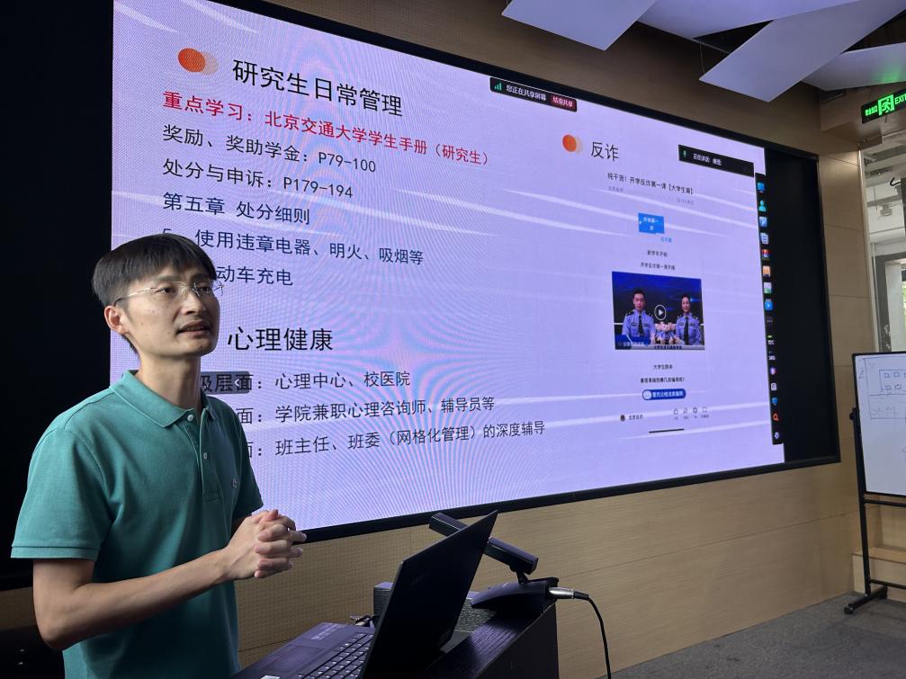 研究生辅导员张帅从思想政治教育及日常管理两方面介绍了《研究生手册》的相关内容。不仅介绍了综合素养实践的考核方式,还关注了安全教育、防诈骗宣传和心理辅导等活动安排,旨在为员工的全面发展和健康成长保驾护航。