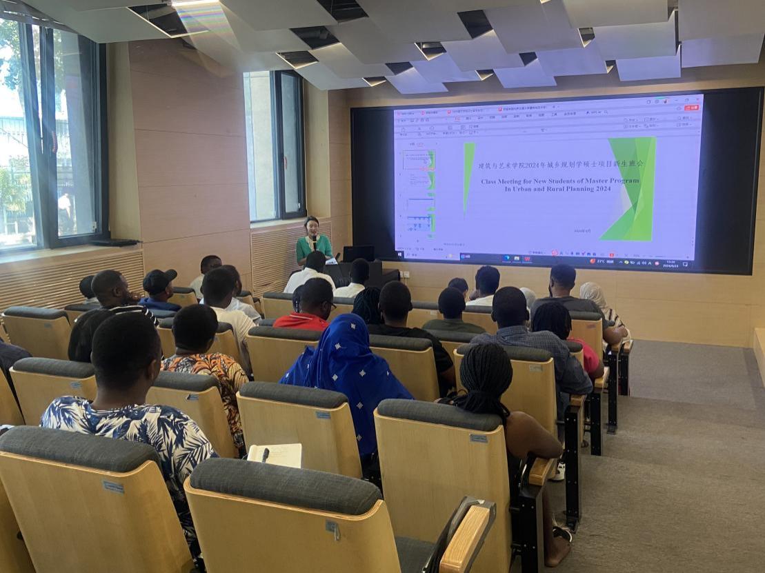 2024年9月23日中午,建筑与艺术学院召开2024级城乡规划全英文硕士项目新生班会。建筑与艺术学院经理韩冰教授、副经理佘高红教授、城乡规划系副主任张纯教授、留学项目辅导员王雅琳,及2024级全体城乡规划英文硕士研究生参加了本次班会。