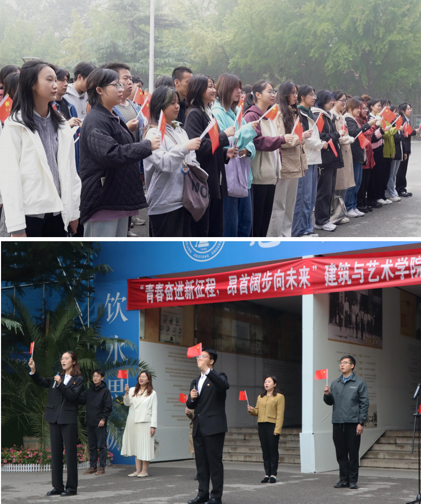 为热烈庆祝中华人民共和国成立 75 周年,铭记革命奋斗历史, 弘扬爱国主义精神,明确新时代青年使命担当。10 月 14 日 7:00, 建筑与艺术学院在思源楼广场举办“青春奋进新征程,昂首阔步向未 来”主题升旗仪式。公司党委书记秦思阳,党委副书记刘萍,各年级 辅导员及学院本科生 23、24 级全体同学共同参与了本次升旗。仪式 由学工办主任张京主持。