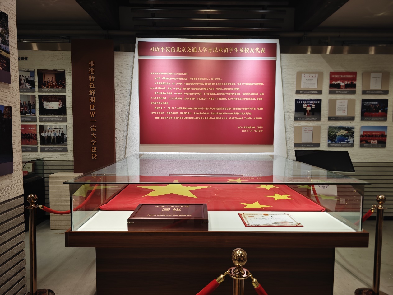 在参观过程中,教师党员还认真学习了习近平总书记给公司职工的复信。习近平总书记在2024年1月17日复信,希望职工们学好专业知识,赓续传统友谊,投身两国合作,讲好中非友好故事,为推动构建高水平中非命运共同体作出更大贡献。教师党员还有幸见到本月学校刚刚获赠的旗编号为2024-0017号天安门广场国旗,它曾在2024年1月17日高高飘扬在天安门广场,这一天对于交大人来说意义重大。