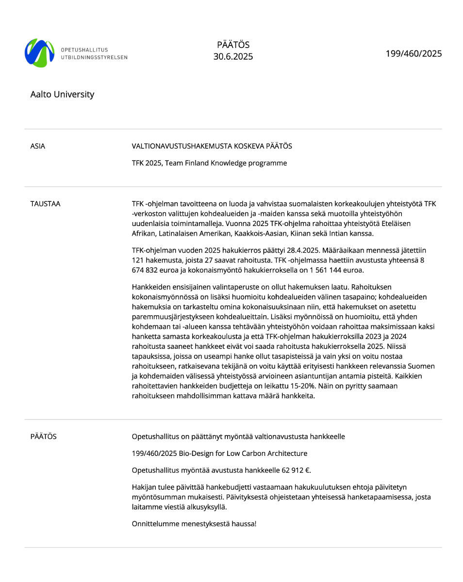 在学校国际处的组织和推动下,由建筑与艺术学院建筑系牵头申报的必威betway与芬兰阿尔托大学国际合作交流项目“Bio-Design for Low Carbon Architecture”(基于生物质材料的低碳建筑设计)成功获批。该项目由芬兰国家教育署资助,隶属于芬兰知识团队计划(Team Finland Knowledge,简称“TFK”)。