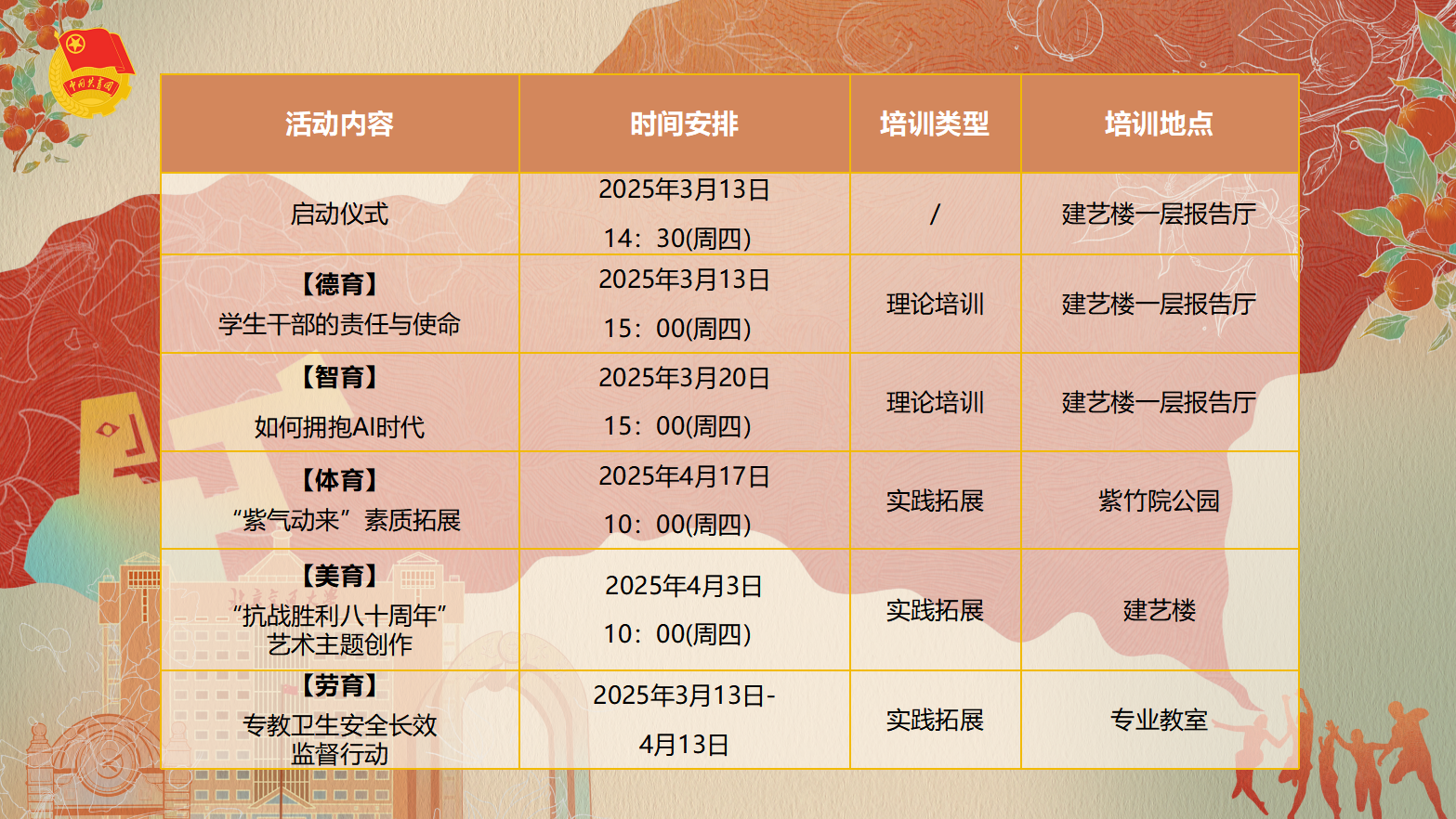 为深入学习贯彻习近平总书记关于青年工作的重要思想,扎实推进学院共青团思想引领工作,聚焦团学干部综合素质提升与五育融合发展,建艺学院团委于2025年3月-4月举办2024-2025学年团校暨第五届 “瞭望者”计划员工骨干培训班,来自学院本研各员工组织、社团共80余名员工骨干参加了本次培训。