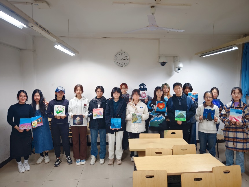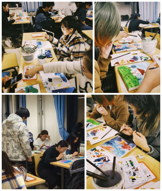 破冰结束后,大家拿起画笔,大胆地调和着颜色,放松身心,用心创作。用画笔诉说着自己的梦境或梦想,导师们耐心引导同学们探索自己内心真实的想法,同时指导调色方法、构图技巧等,让大家的梦境能够更美地呈现。创作完毕后,同学们纷纷展示自己的作品,分享自己的梦想与梦境,有星空、原野、虚拟画面等等,每一张独具特色的画面,都讲述着自己的所感所想。